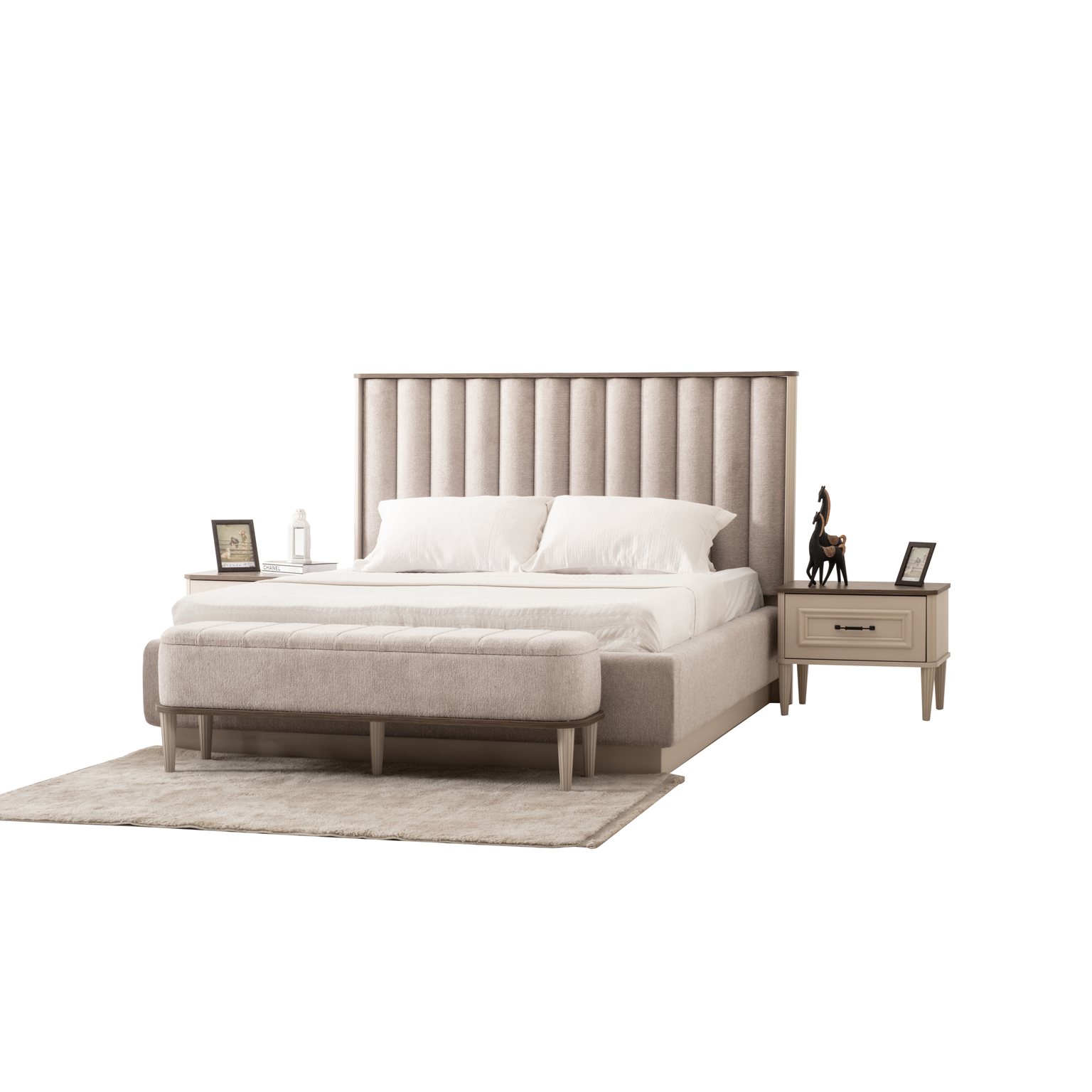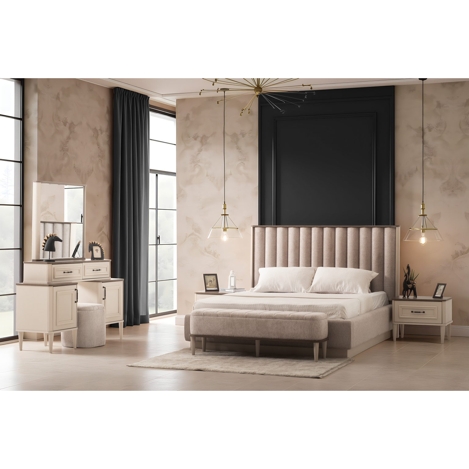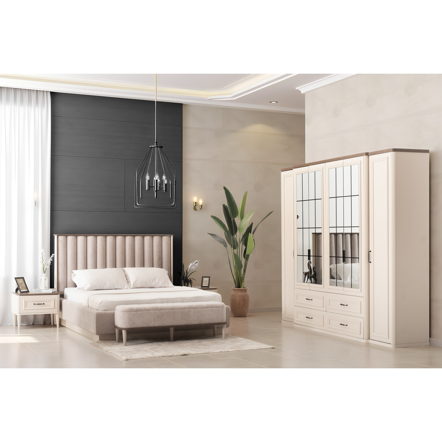 Takım İçeriği Dolap, Karyola, Karyola Başucu, Şifonyer ve Aynası, 2 Adet Komodin (Takım içeriğini bazalı karyola olarak değiştirebilirsiniz.)
